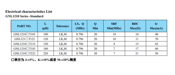 GNL1210J221貼片電感的參數(shù):感值:22uH±5%,阻值:21mΩ,電流50mA。如下圖: